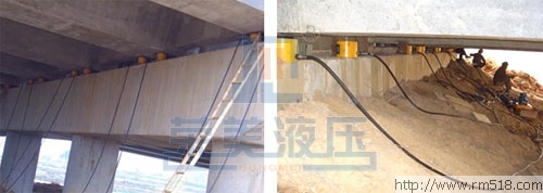 采用薄型千斤頂或自鎖式千斤頂頂升橋梁,更換墊層,放回新的橋墩位置。看起來液壓似乎能做任何事情,當面對這一類工程問題時,系統設計就成為了關鍵的問題,通過我們與客戶之間的密切合作以及我們在該領域豐富的知識經驗積累,可以使這類工程取得圓滿成功。同時配備不同長度的高壓油管和合適的分配閥,采用一泵拖多頂(拖四、拖六、拖八、拖十等)的方法以滿足適應施工現場的作業要求。 |