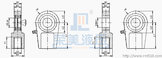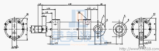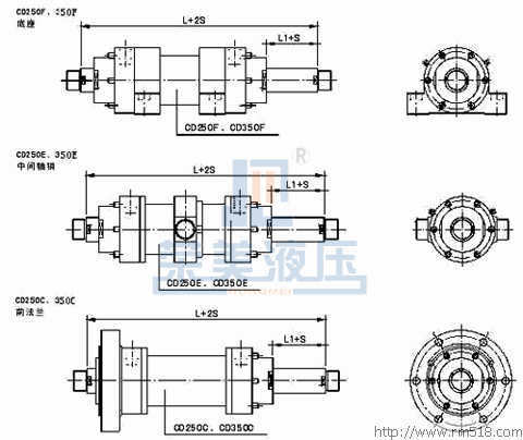 E -安裝形式:A=尾部單耳環帶襯套;B=尾部單耳環帶關節軸承;C=前法蘭;D=后法蘭;E=中間軸銷;F=底座